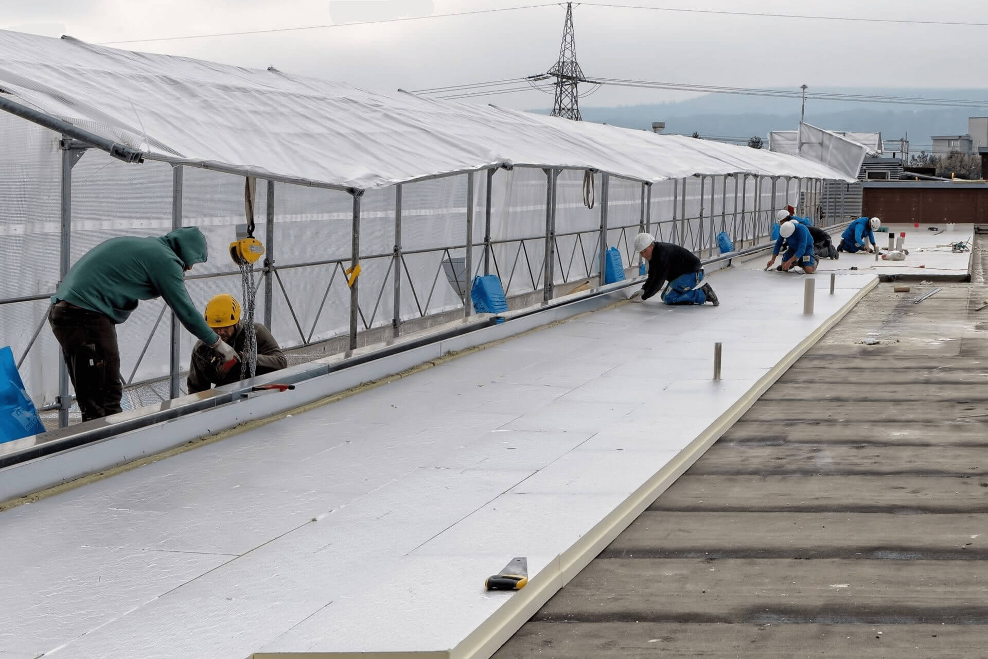 Використання PIR-плит в будівництві дозволяє не просто підвищити його якість, але й досягнути суттєвої економії, наприклад за рахунок зниження вартості робіт по монтажу плоских покрівель. Справа в тому, що термостійка PIR-покрівля не потребує захисної стяжки та дозволяє використовувати рулонну гідроізоляцію із синтетичних ПВХ-мембран, що монтується безпосередньо на плити утеплювача. За рахунок цього монтаж виходить приблизно в 1,5 раза дешевше і в 2 рази швидше, чим в системах зі стяжкою та традиційною гідроізоляцією.